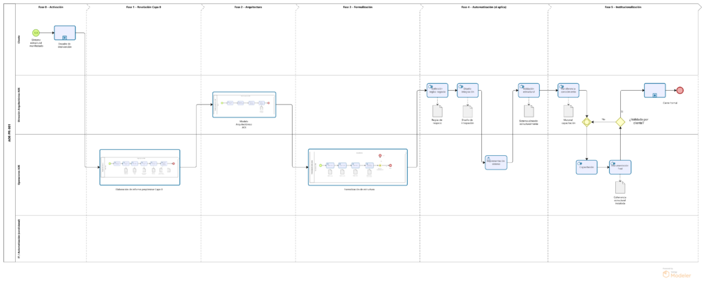 La metodología AOE organiza la intervención en una serie de fases que permiten avanzar progresivamente desde la comprensión del sistema organizacional hasta la consolidación de una arquitectura operativa sostenible.